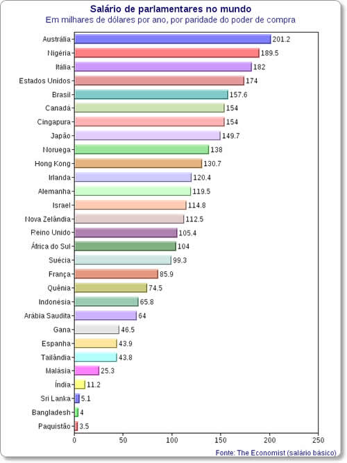 Entre os 29 locais examinados pela revista, apenas quatro pagam mais que o Brasil aos seus parlamentares, em termos absolutos: Nigéria, Itália, Estados Unidos e Austrália. Desses, no entanto, somente a Nigéria é mais pobre que o Brasil, em termos de PIB per capita.